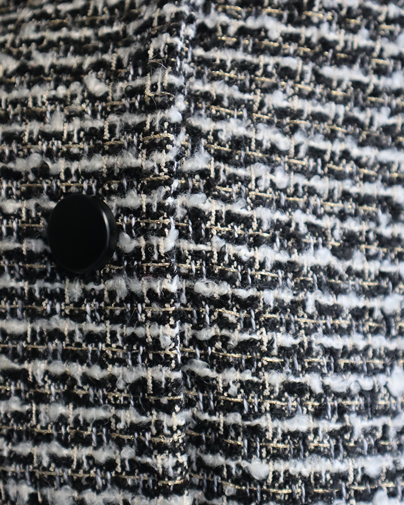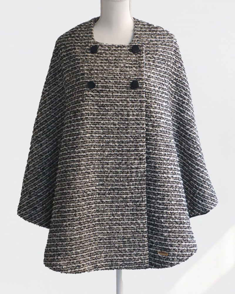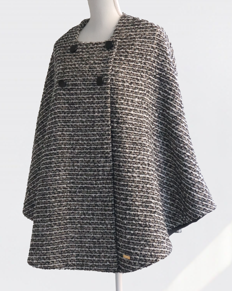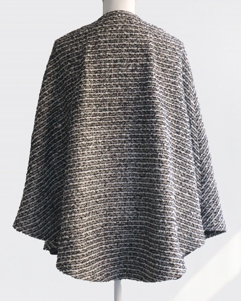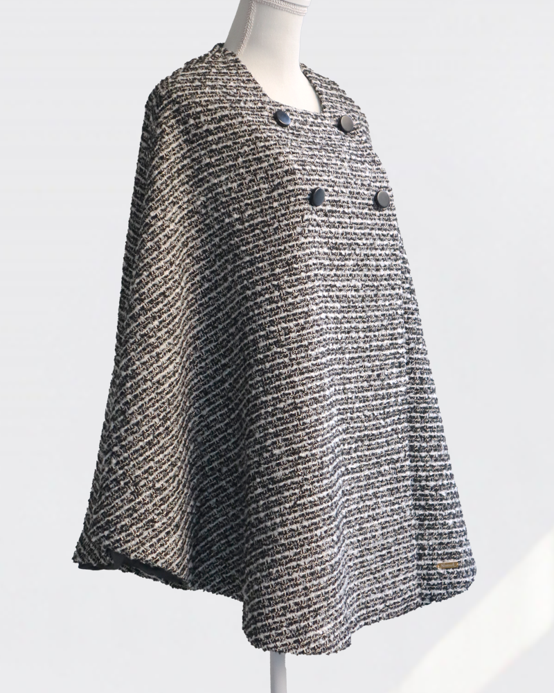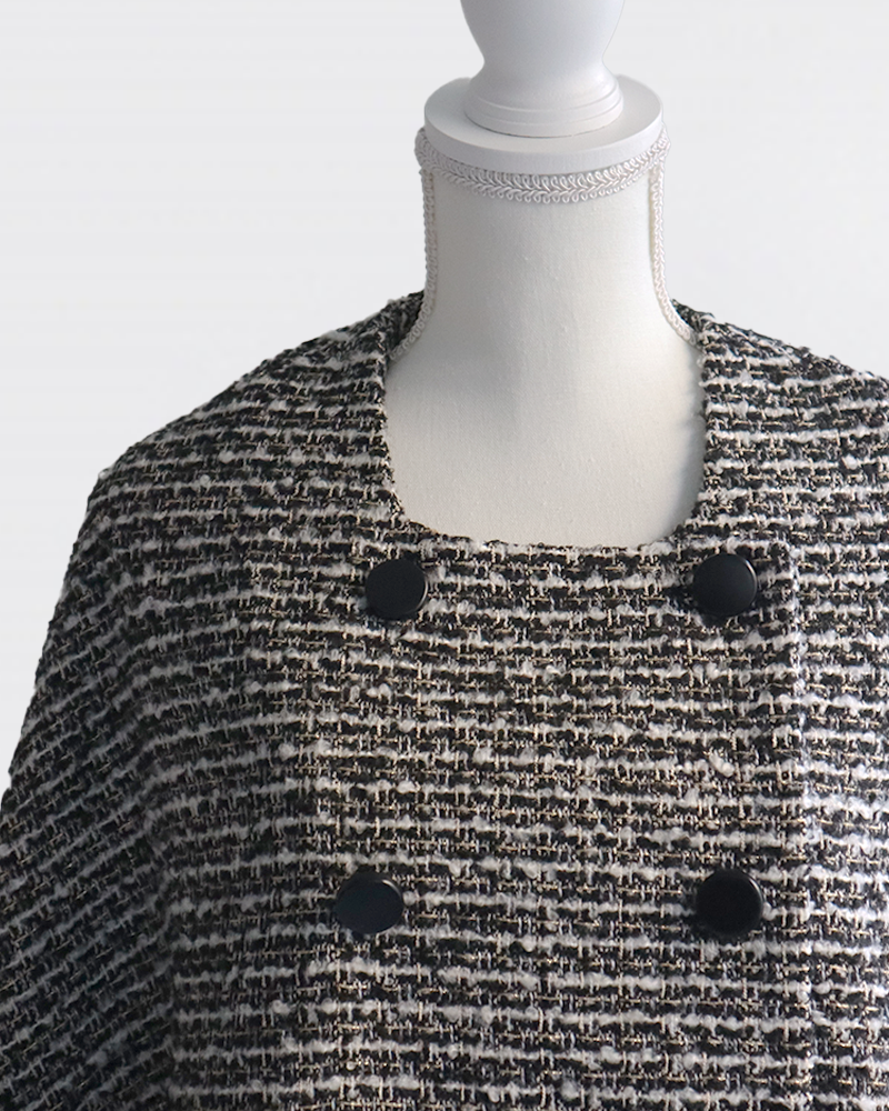 柔らかなブラックとホワイトのブークレツイードに、控えめなゴールド糸を織り込んだ上品なケープです。動くたびにミックスカラーの表情が繊細に変わり、光の角度でニュアンスが生まれます。