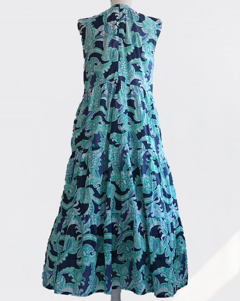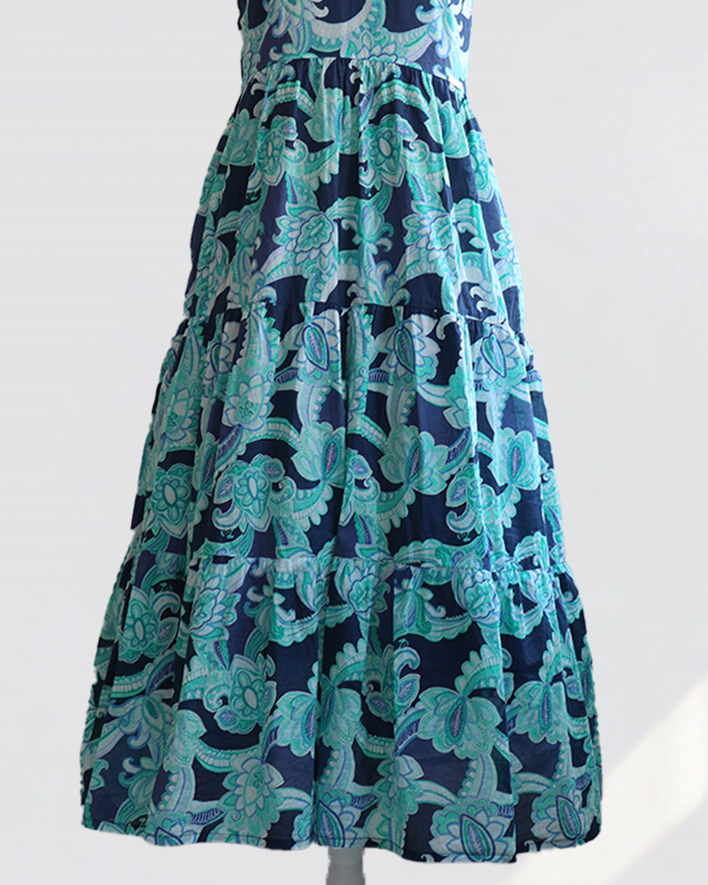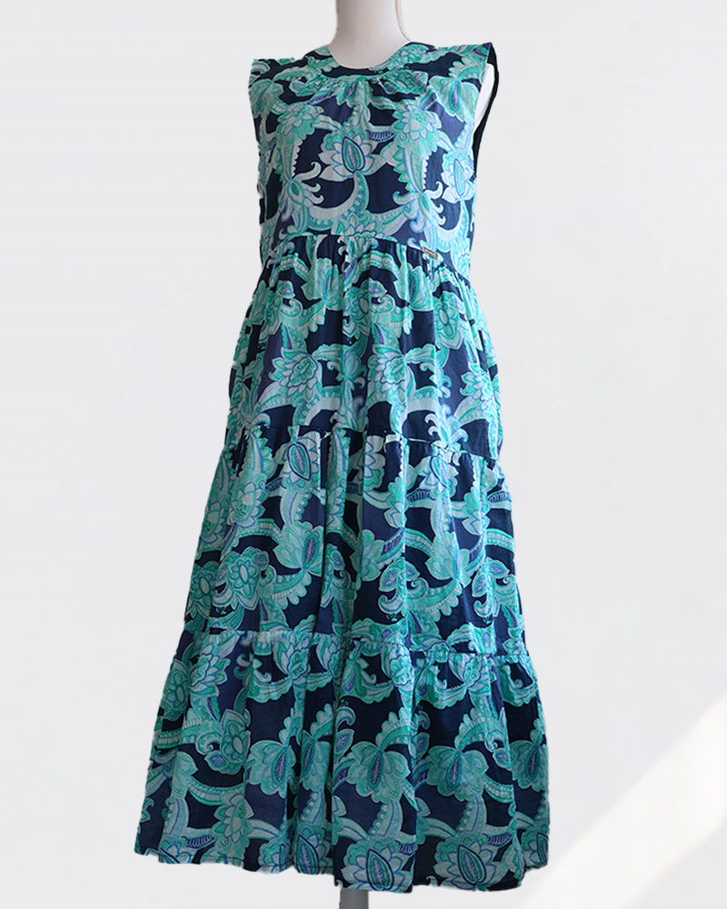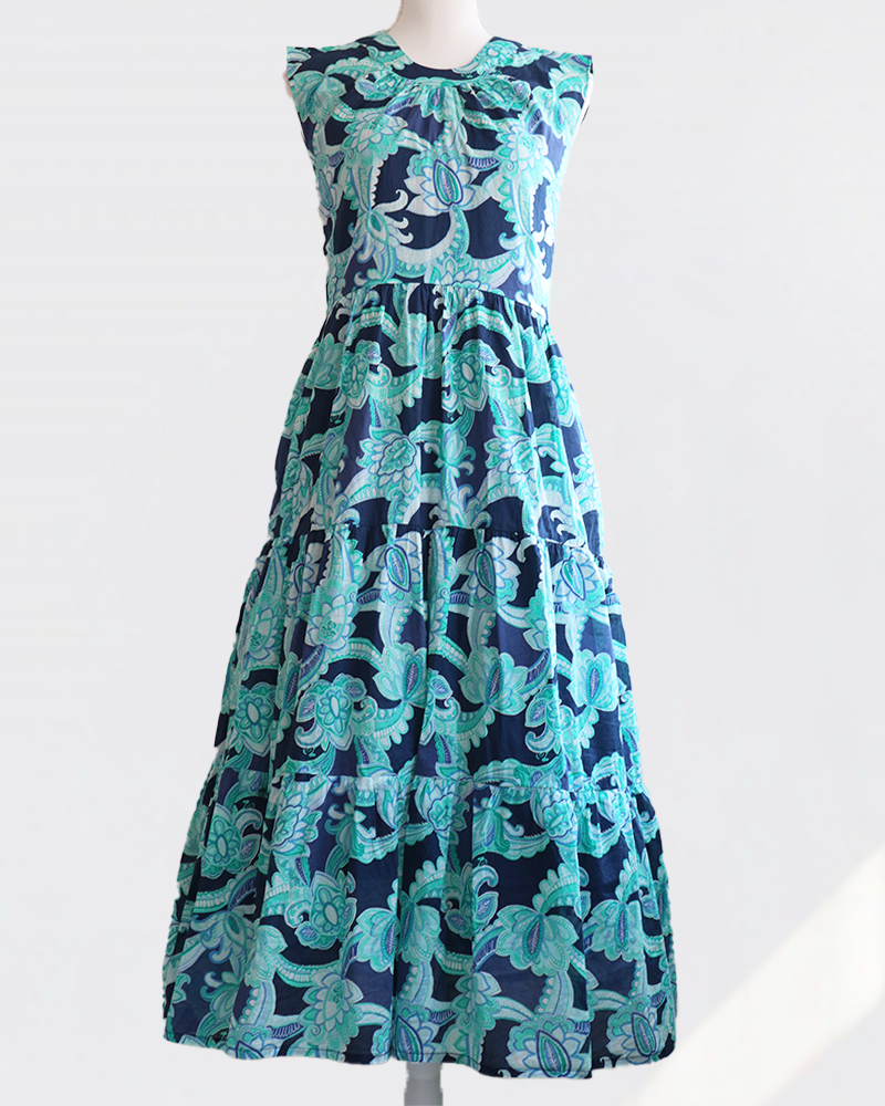 ハイウエストで仕立てた3段ティアードのロングワンピースです。