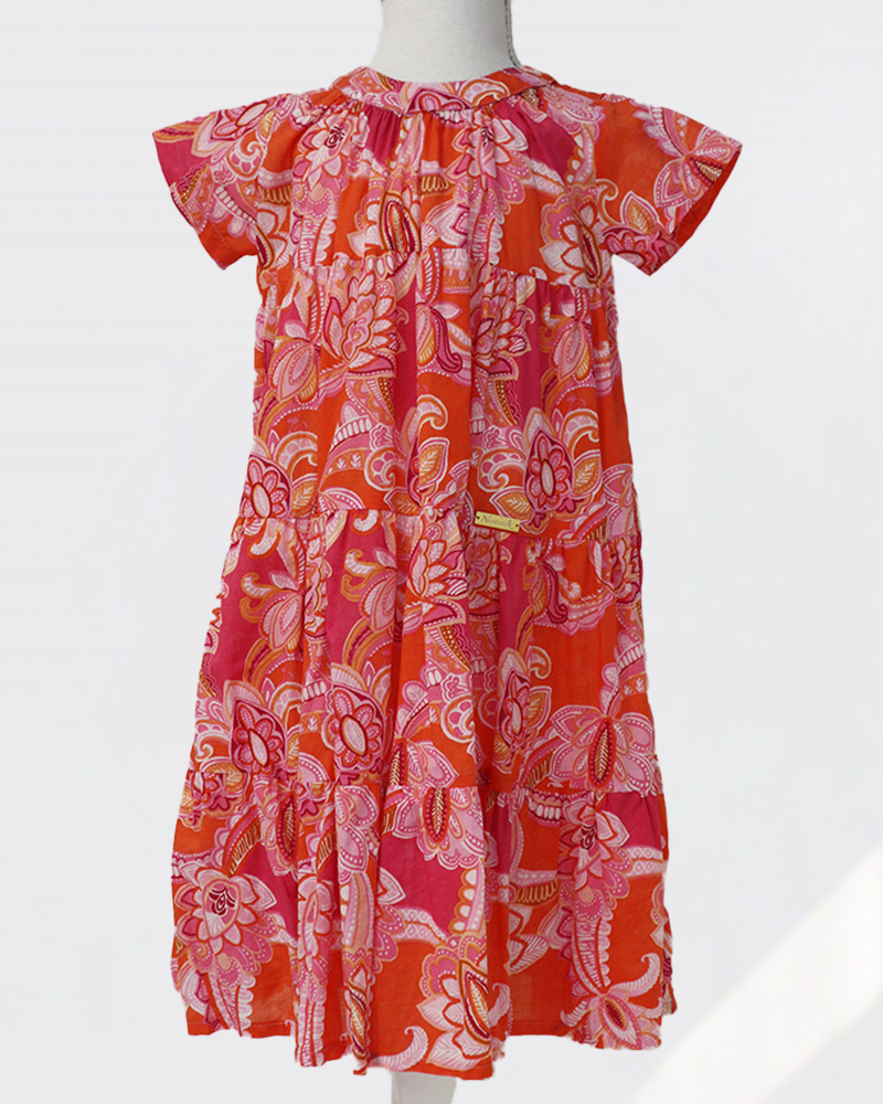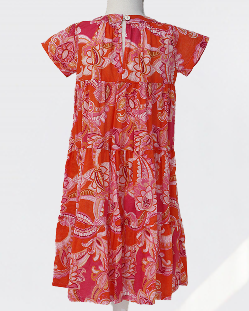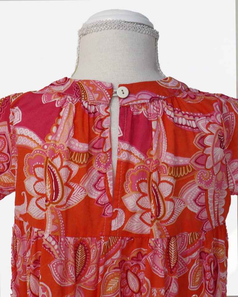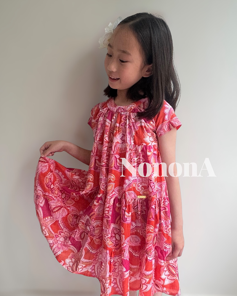 キッズサイズは、ふんわりと広がる3段ストレートのシルエットに仕立てました。ウエストの絞りをなくすことで、動きやすさとリラックス感を大切にしたデザインです。軽やかなコットン素材ならではの心地よさがあり、汗を掻きやすいお子さまにも安心して着ていただけます。