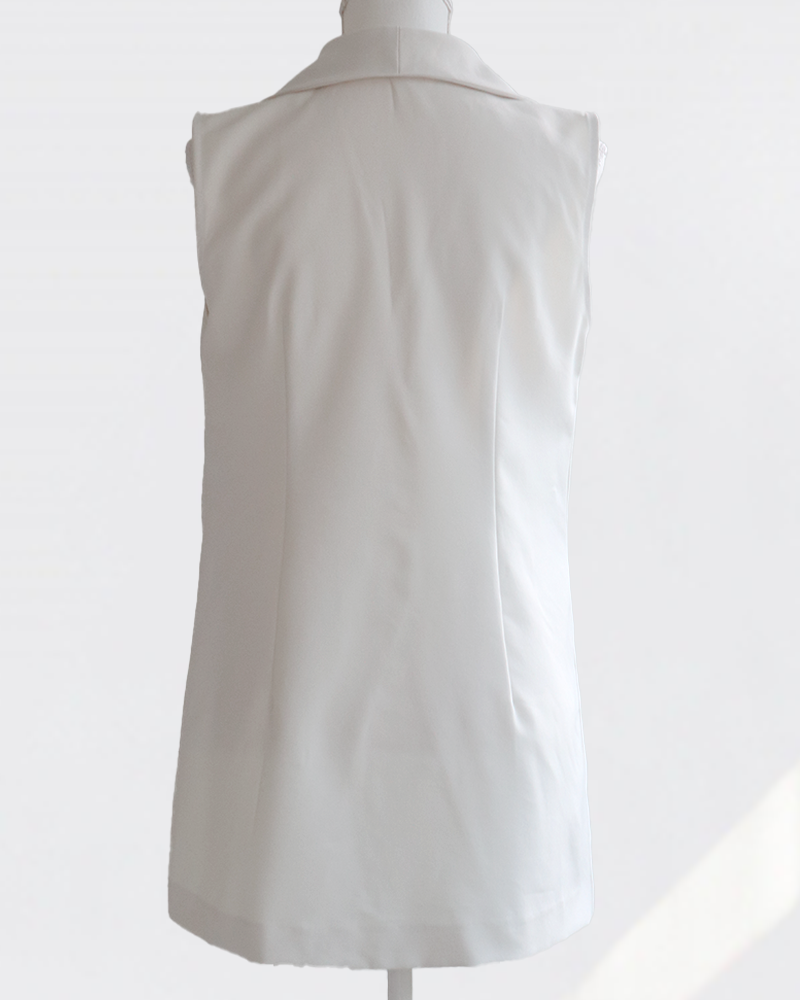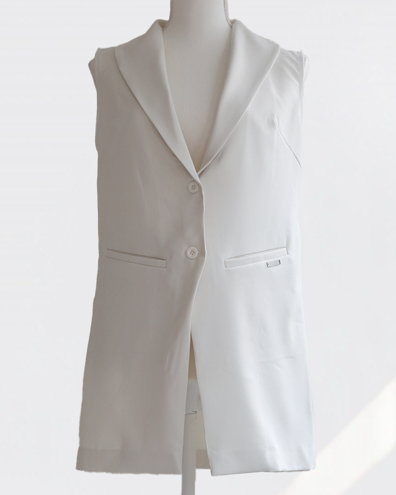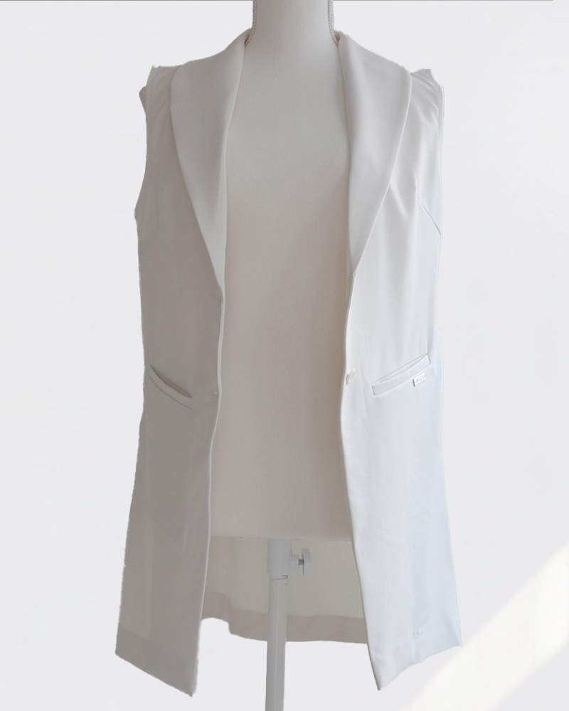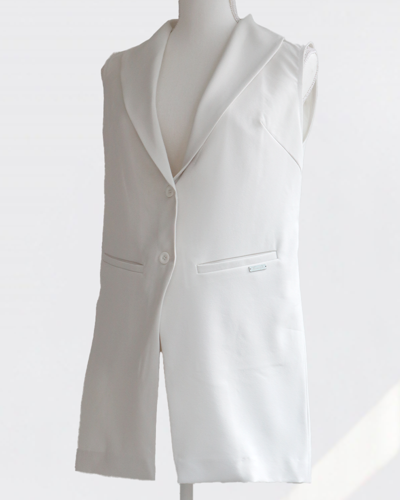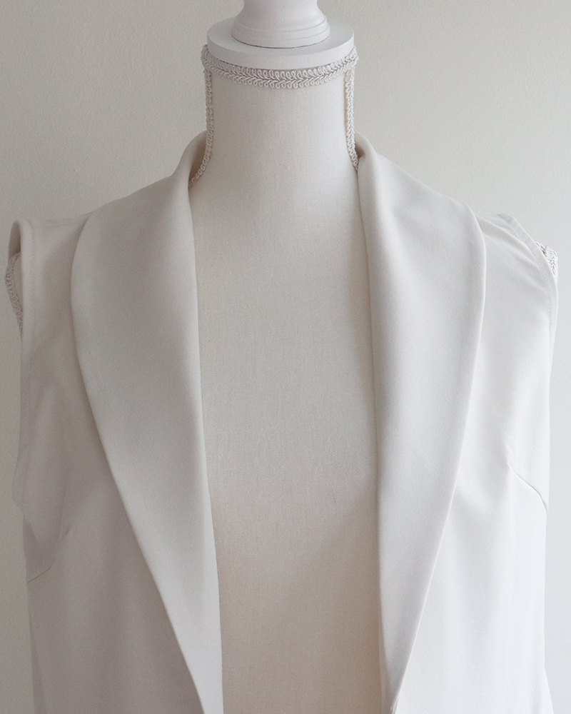 ジャケットはすっきりとしたシルエットに仕立て、袖を省いたデザインのため、汚れを気にせず軽やかに着こなせるのが特徴です。