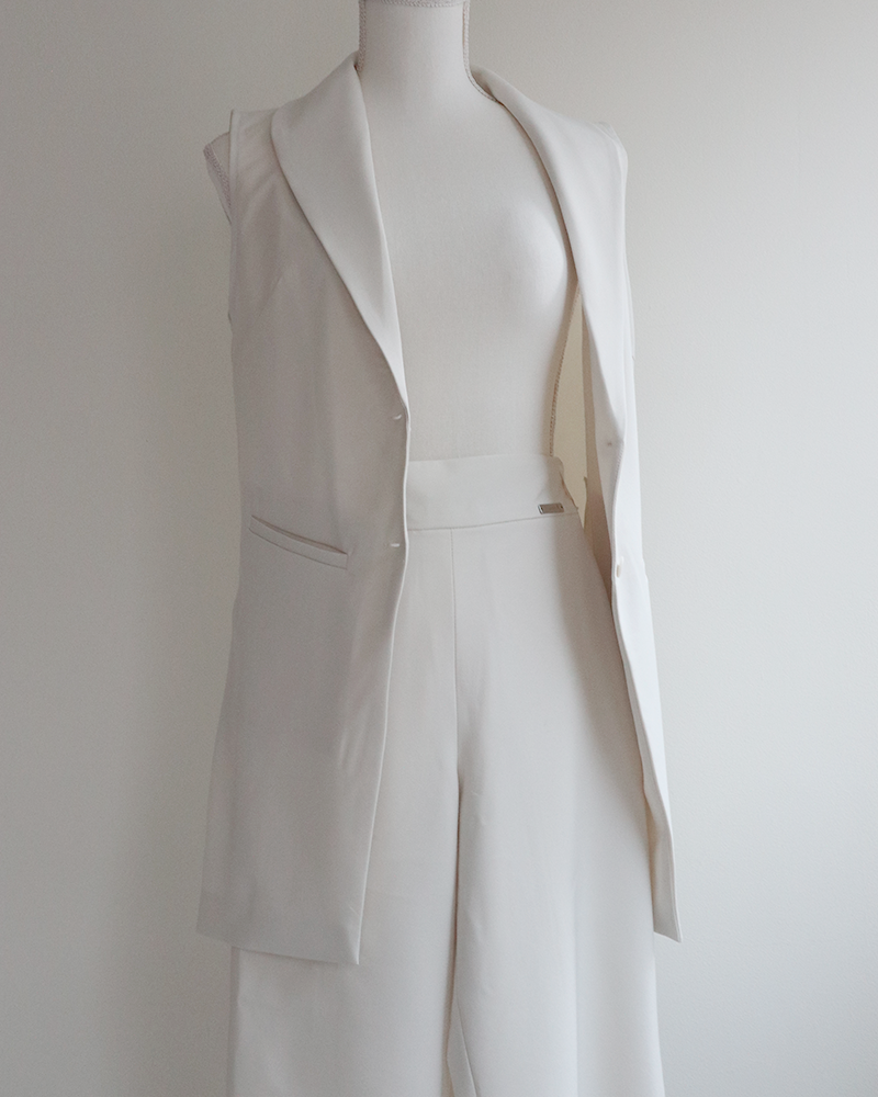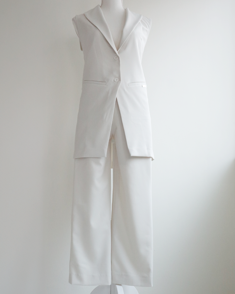 清潔感とシャープさを兼ね備えたホワイトのパンツスーツです。
