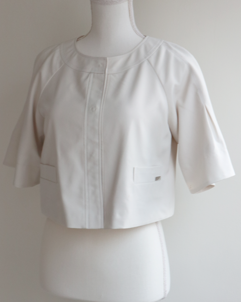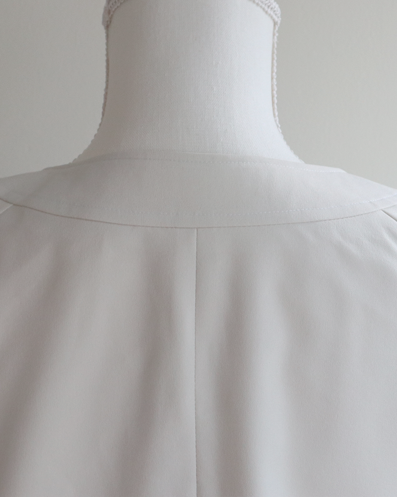 肩幅を選ばず、インナーに何を合わせてもすっきりと着られる設計が魅力です。袖にはタックを入れることで立体感が生まれ、腕まわりに余裕を持たせつつも上品な表情を添えています。