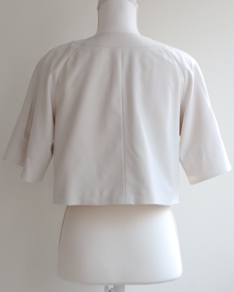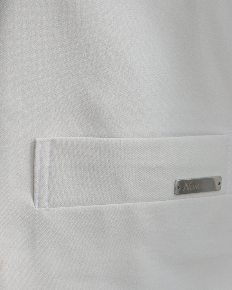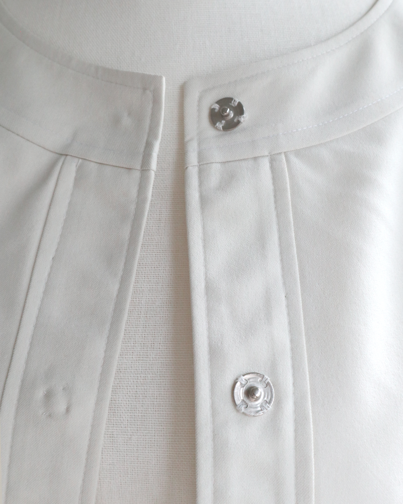 また、七分丈の袖は季節を問わず活躍しやすく、オフィスシーンでも長い期間着用いただける実用性を備えました。清潔感のあるホワイトカラーは、どんなスタイルにも調和し、シンプルながらも洗練された印象を与える一着です。